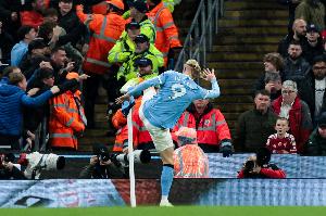 体育资讯11月10日讯 英超第11轮比赛,曼城在伊蒂哈德球场迎战利物浦。本场比赛,主队前锋哈兰德尽管在上半场错失1粒点球,但他之后头槌破门为球队首开纪录。
