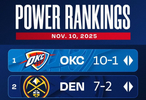 直播吧11月11日讯 官方发布了最新一期球队实力榜,其中前两名没有变化,依旧是雷霆和掘金。而火箭升至了第三位,尼克斯也升到了第四位。