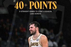 体育资讯11月2日讯 湖人官方晒出东契奇40+得分海报,并配文写道:“开季连续3场拿下40+分的球员:卢卡-东契奇、威尔特-张伯伦。”