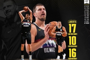这是约基奇赛季第10次三双,掘金官方发布数据海报,并写道:三双上双!