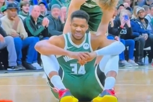 😶不妙!字母哥无对抗倒地+抚摸右小腿 表情不是很好