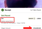 一名赌徒下注1.5万美元,押注勒布朗得10分以上。