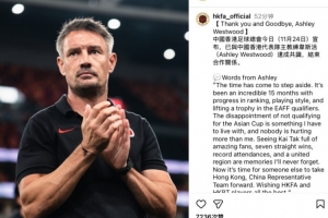 无缘亚洲杯,官方:中国香港队主教练阿什利·韦斯特伍德下课